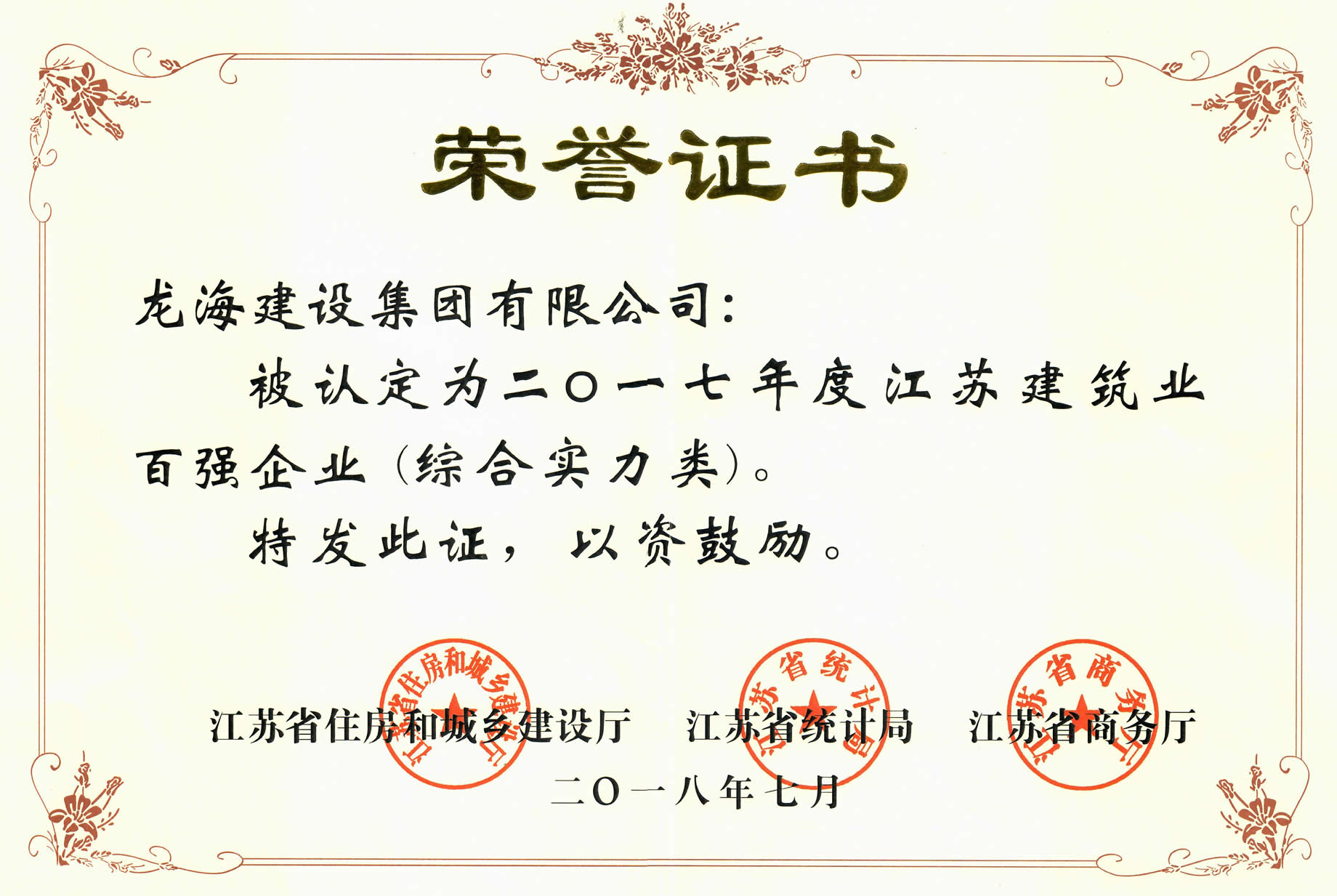 為充分發(fā)揮優(yōu)勢骨干企業(yè)在全行業(yè)中的示范引領(lǐng)作用,打造企業(yè)品牌形象,省住房城鄉(xiāng)建設(shè)廳、統(tǒng)計局、商務廳成立了“百強企業(yè)”認定委員會,并按照有關(guān)程序,組織開展了2017年度建筑業(yè)“百強企業(yè)”認定活動。經(jīng)評審,集團公司脫穎而出,被授予“2017年度江蘇省建筑業(yè)百強企業(yè)(綜合實力類)”榮譽稱號,位列第二十二。按照《江蘇省建筑業(yè)企業(yè)信用綜合評價辦法》(蘇建建管〔2016〕82號)文件精神,自發(fā)布之日起的一年內(nèi),“百強企業(yè)”可在施工企業(yè)信用考評中作為省級獎勵予以加分。
